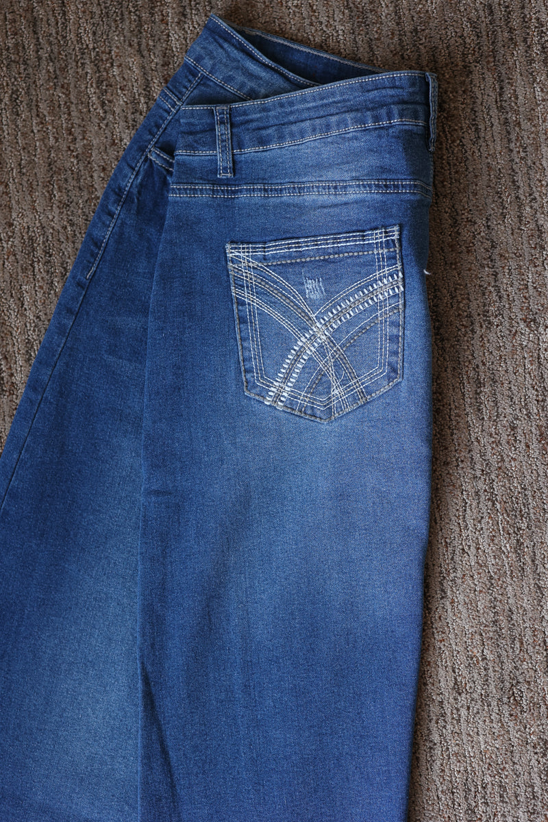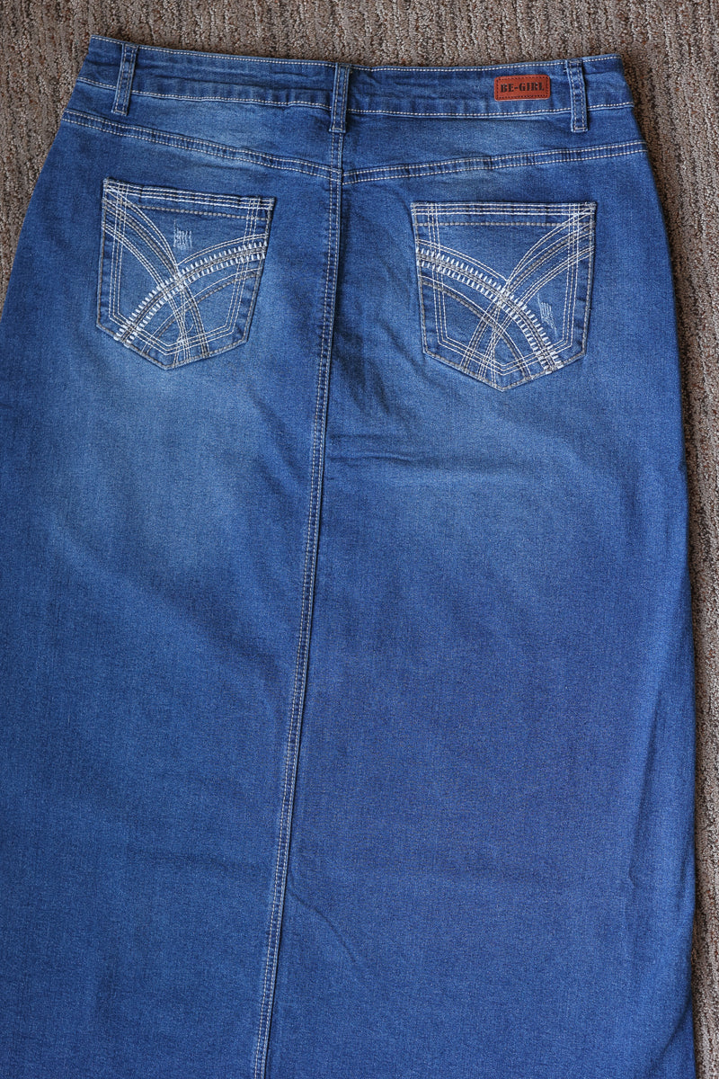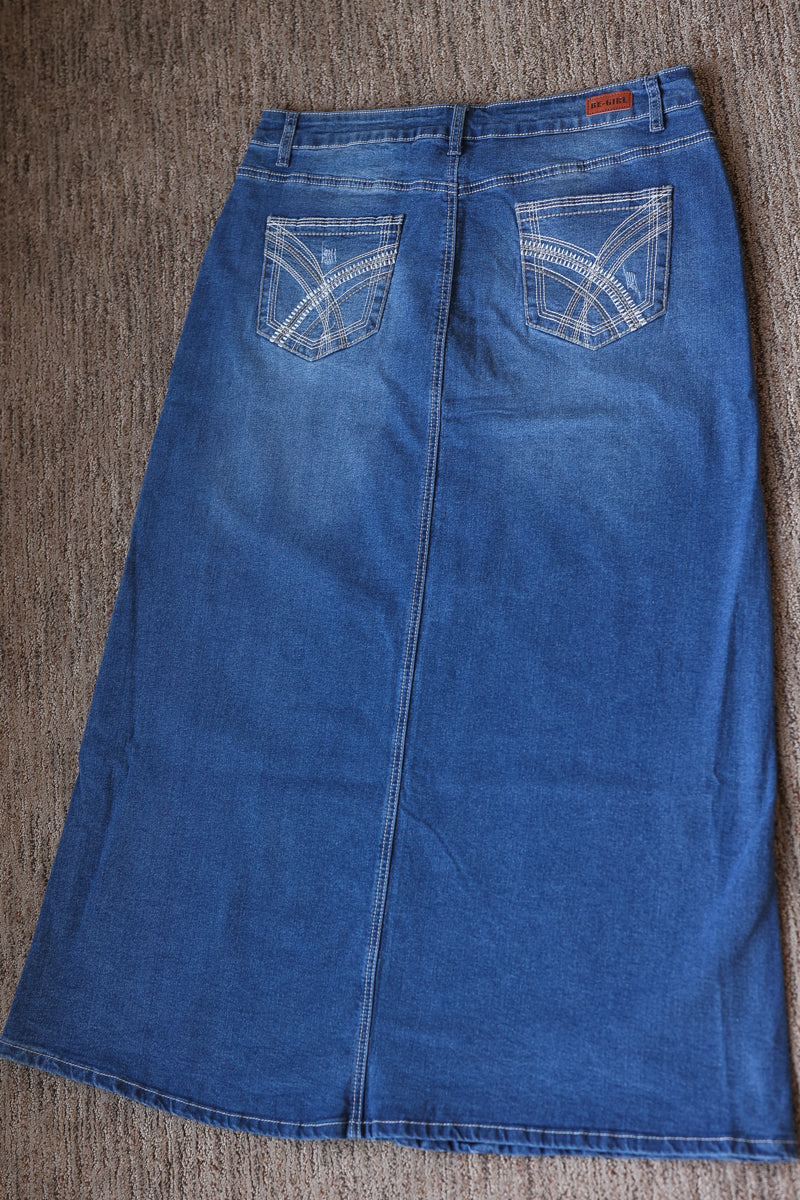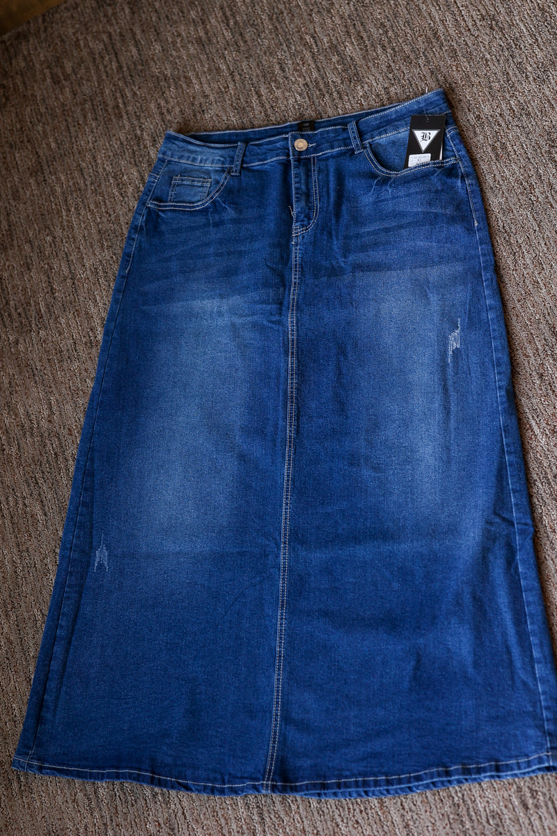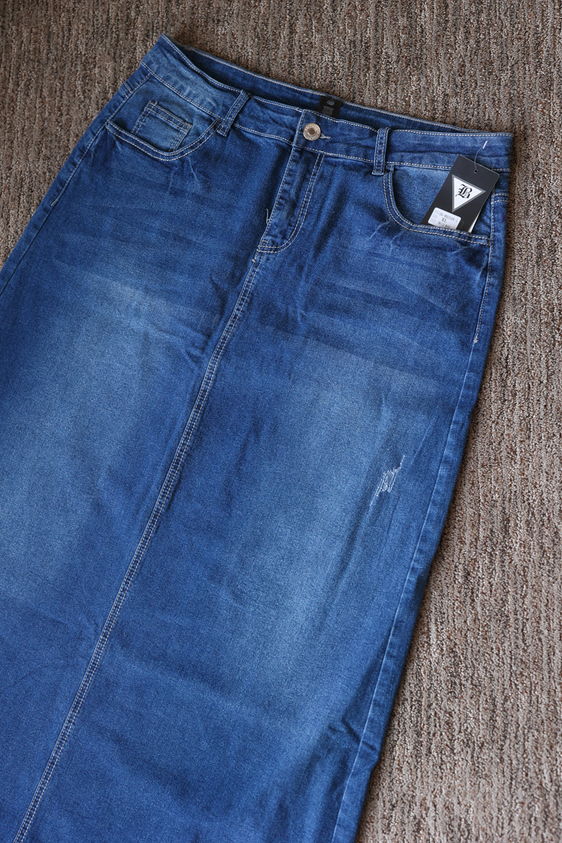 Aria Long Denim Skirt - 1X-3X PLUS High-Stretch Modest Long Denim Skirt