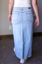 Grace Light Wash Fray Hem Long Denim Skirt