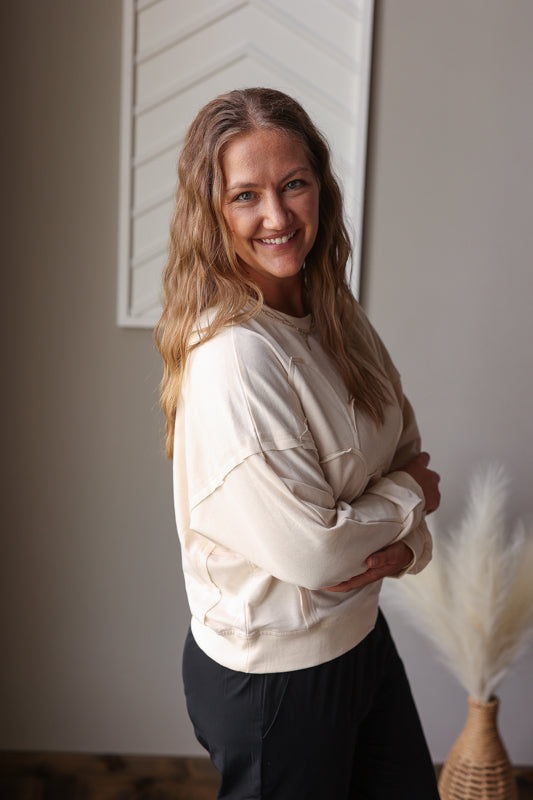 This beige flower patch drop shoulder top offers a cozy, stylish look perfect for everyday wear and effortless pairing.