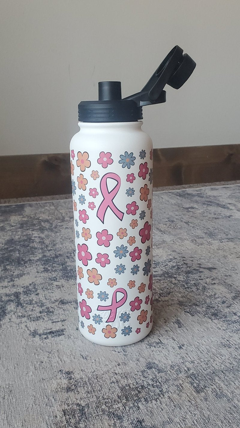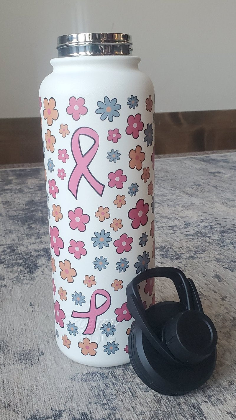 Stay hydrated with our Breast Cancer Daisy Frosted Frog 40 oz. Tumbler! This custom-made tumbler features a cheerful daisy and breast cancer ribbon design, carry along handle, and its twist-off cap with a flip back feature ensures no spills or lost caps. Stay stylish and functional with this tumbler on your next outing.