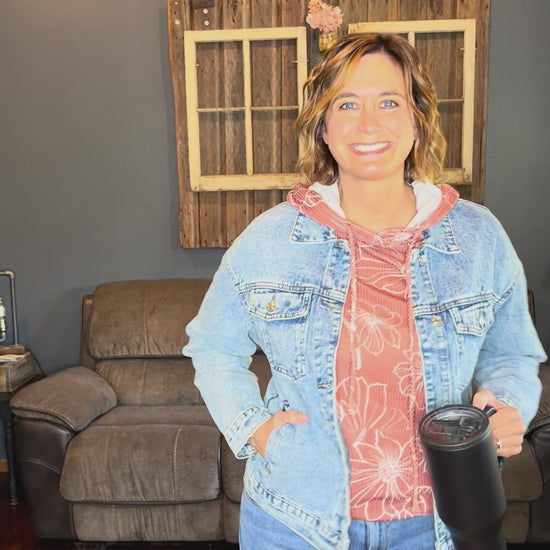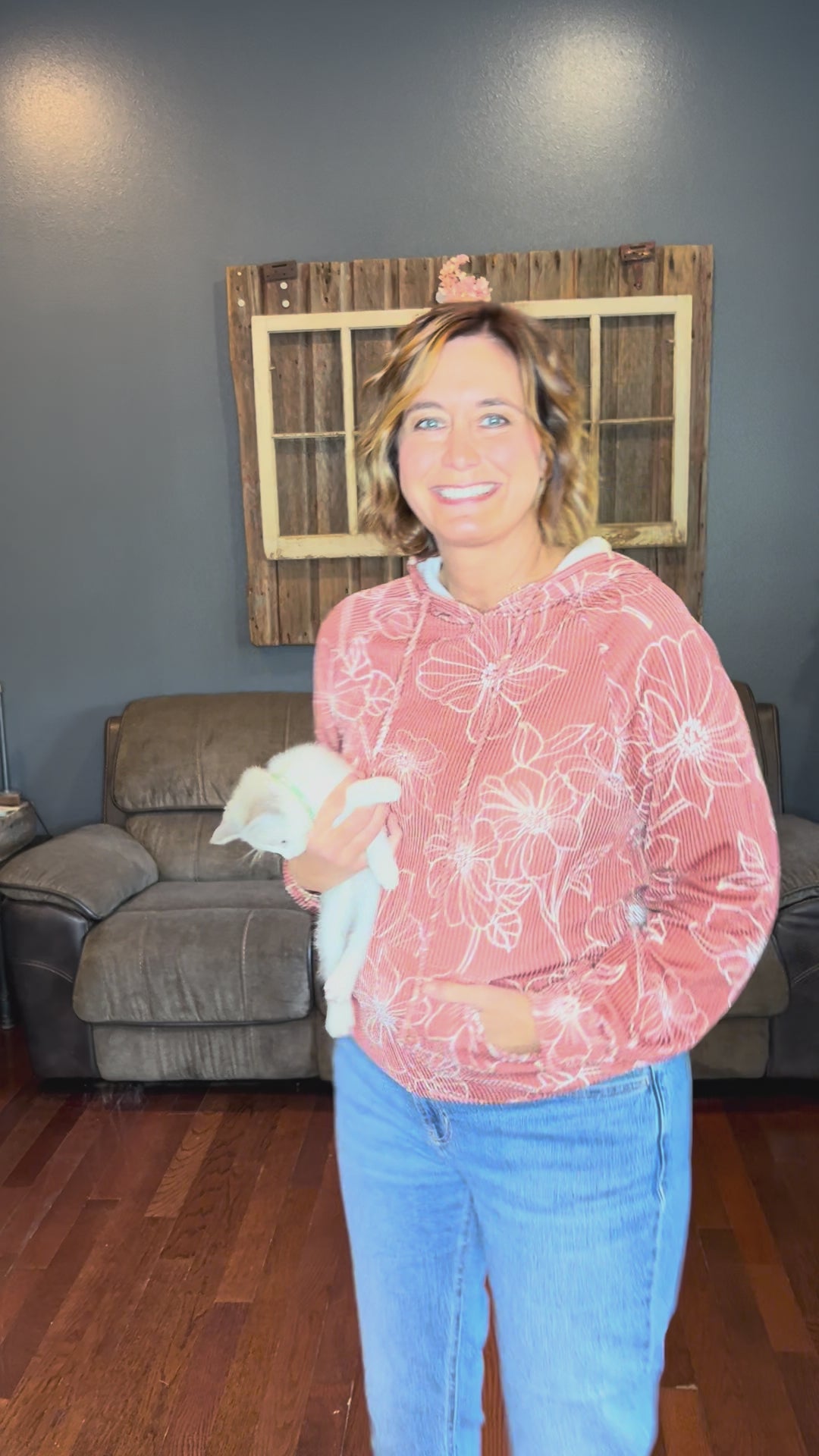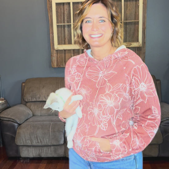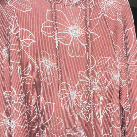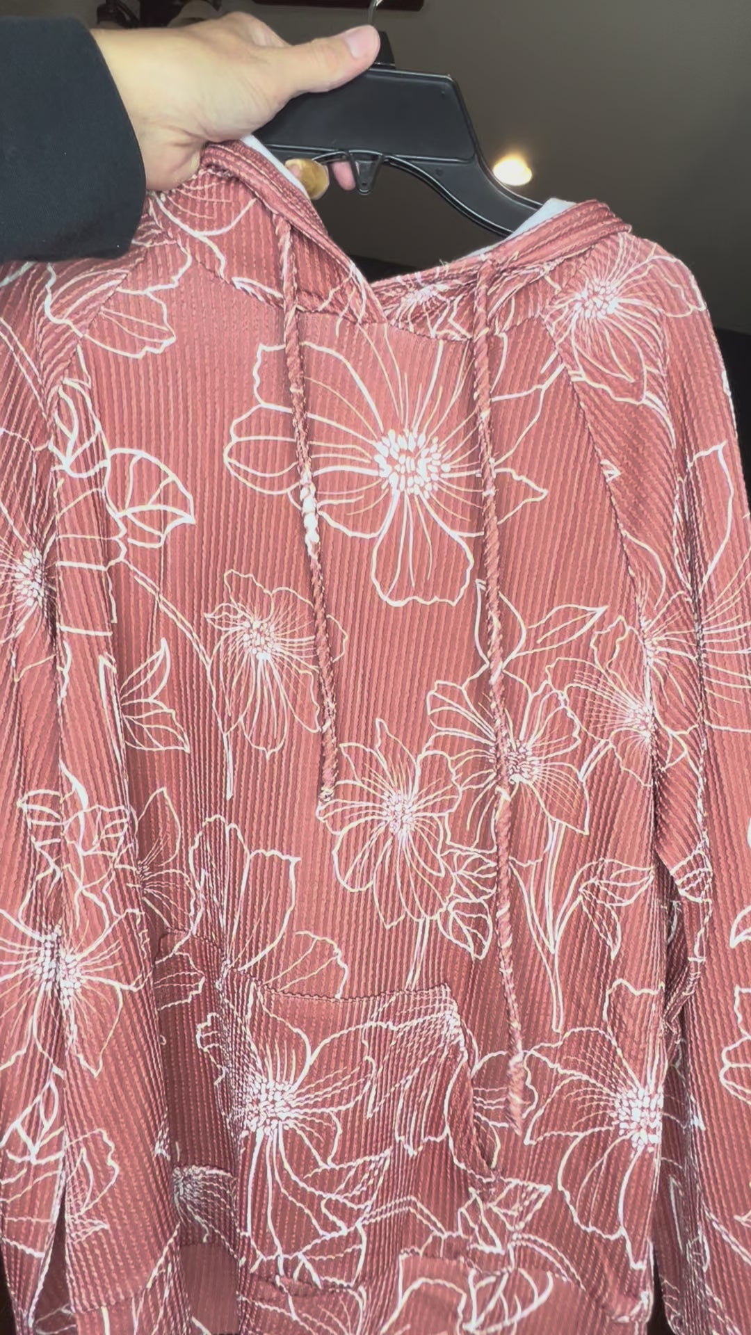 Stay cozy and stylish with the Brown Floral Ribbed Hoodie in a beautiful rust brown shade with a feminine white floral print.