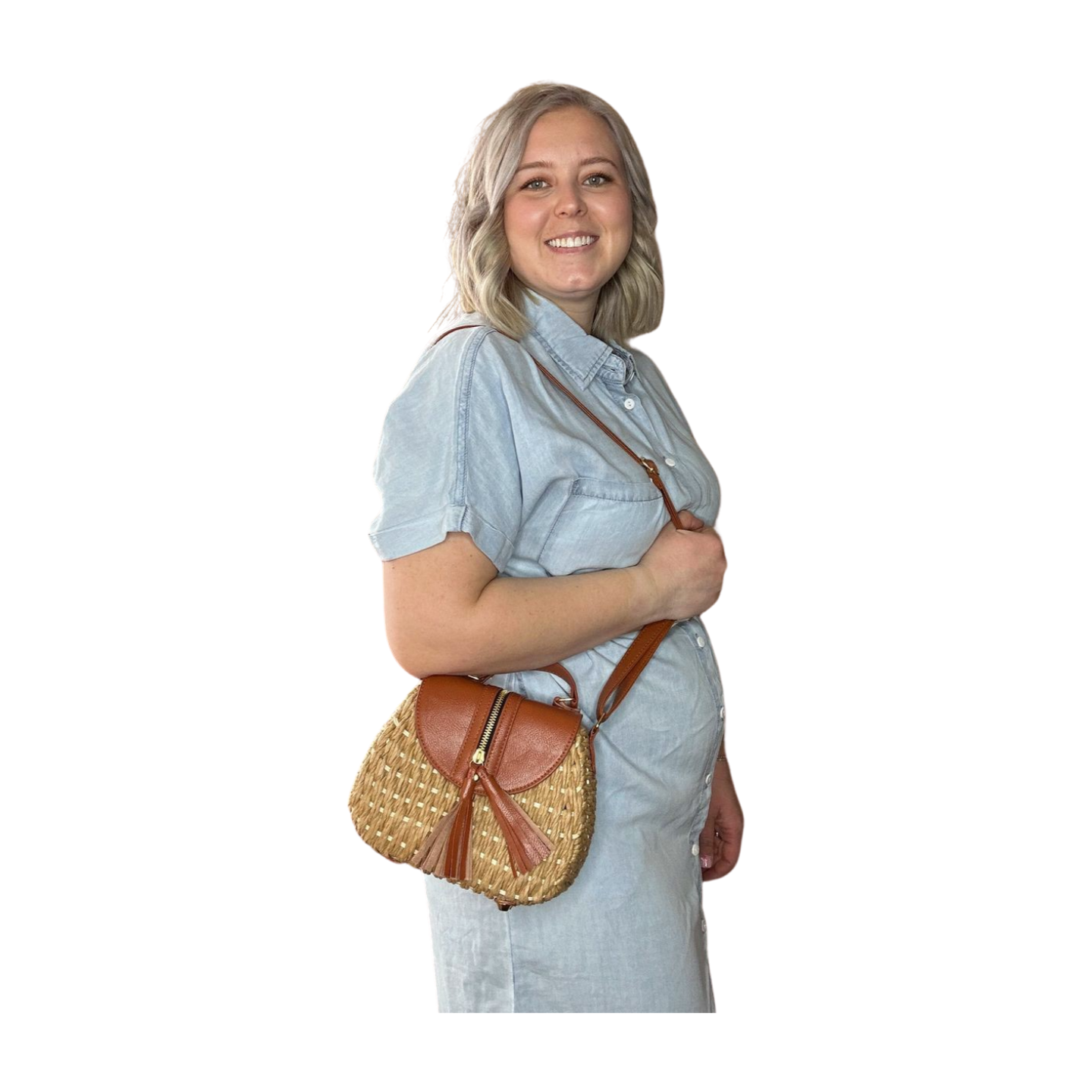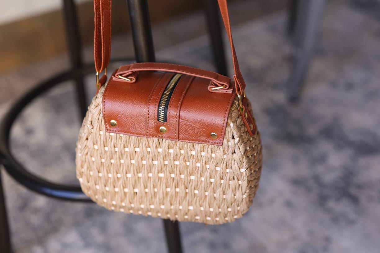 Khaki Bamboo Weaving Leather Shoulder Handbag with Faux Zipper detail!