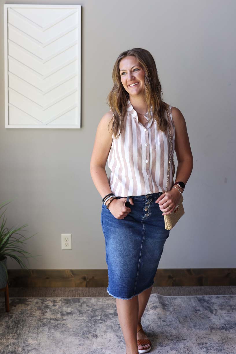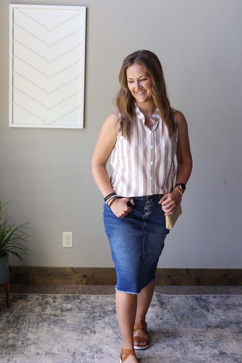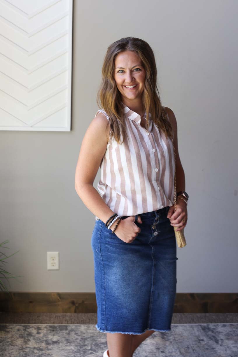 This khaki stripe sleeveless button-up is your new wardrobe bestie! Perfect for work meetings or fun date nights with its chic vertical stripes and flattering fit. So versatile - wear it alone on warm days or layer with your favorite cardigan or denim jacket for endless outfit possibilities! The button-up style adds just the right touch of polish to keep you looking put-together for any occasion.
