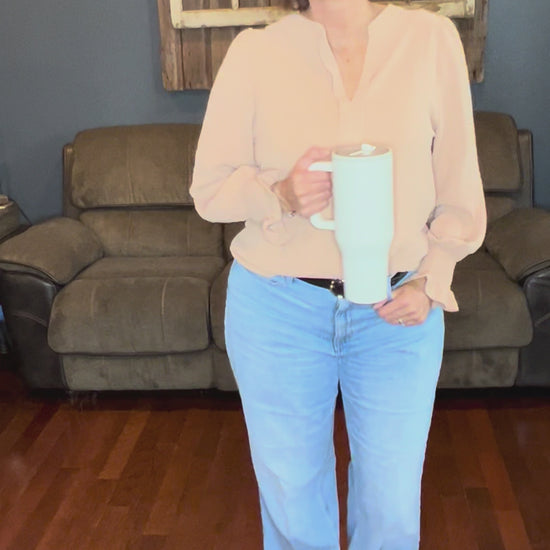 Elevate your wardrobe with this adorable Caramel Shirred Cuff Long Sleeve Blouse! This cute, lightweight V-neck blouse features chic, smocked ruffle cuffs that add a playful touch to any outfit. Perfect for office days with your favorite denim, special occasions like weddings and church, or a date night. So versatile, stylish, and comfortable.