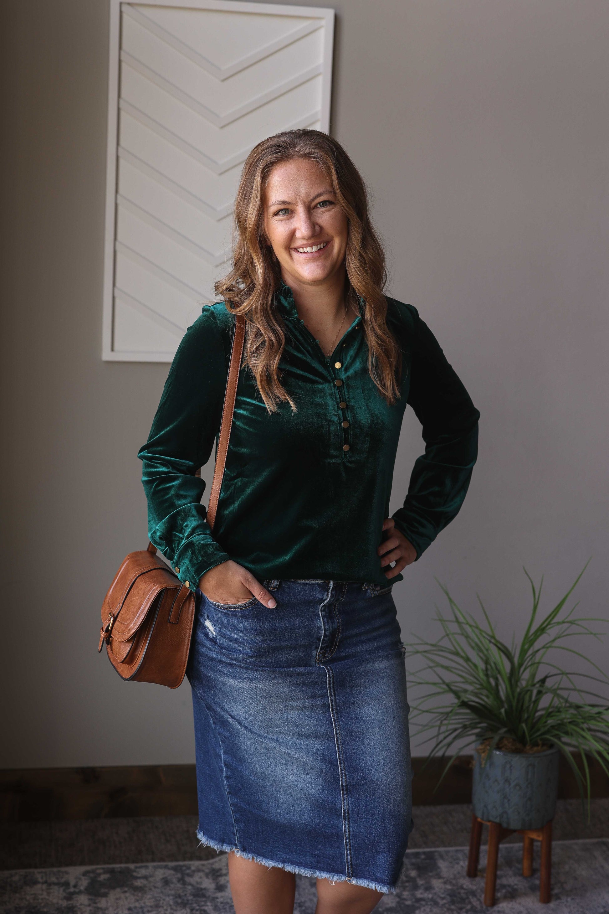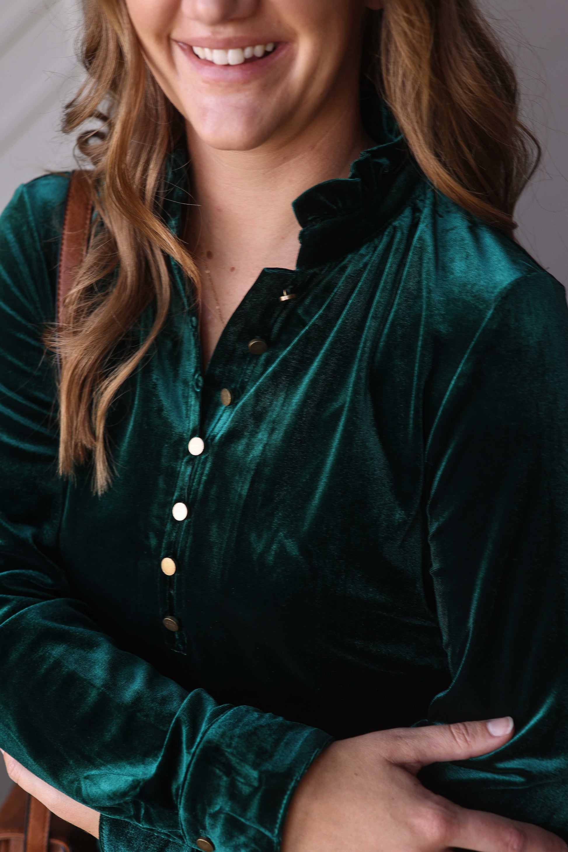 Feel stylish this holiday season with our beautiful Emerald Green Velvet Top. Experience luxurious comfort with its soft velvet texture and elevate your style with its elegant gold henley buttons. Perfect for any occasion, from holiday gatherings to work to date nights, this blouse is a must-have in your wardrobe.