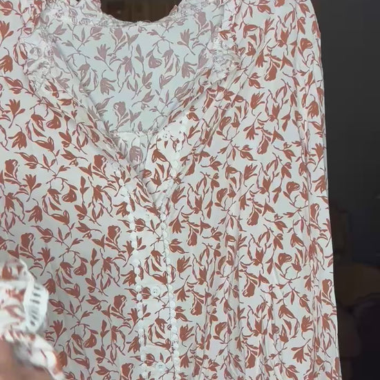 Upgrade your wardrobe with the Khaki Printed Lace Detail Button Up Shirt, a chic and feminine blouse featuring delicate balloon sleeves, feminine lace accents, and a stunning floral rust print perfect for fall occasions.