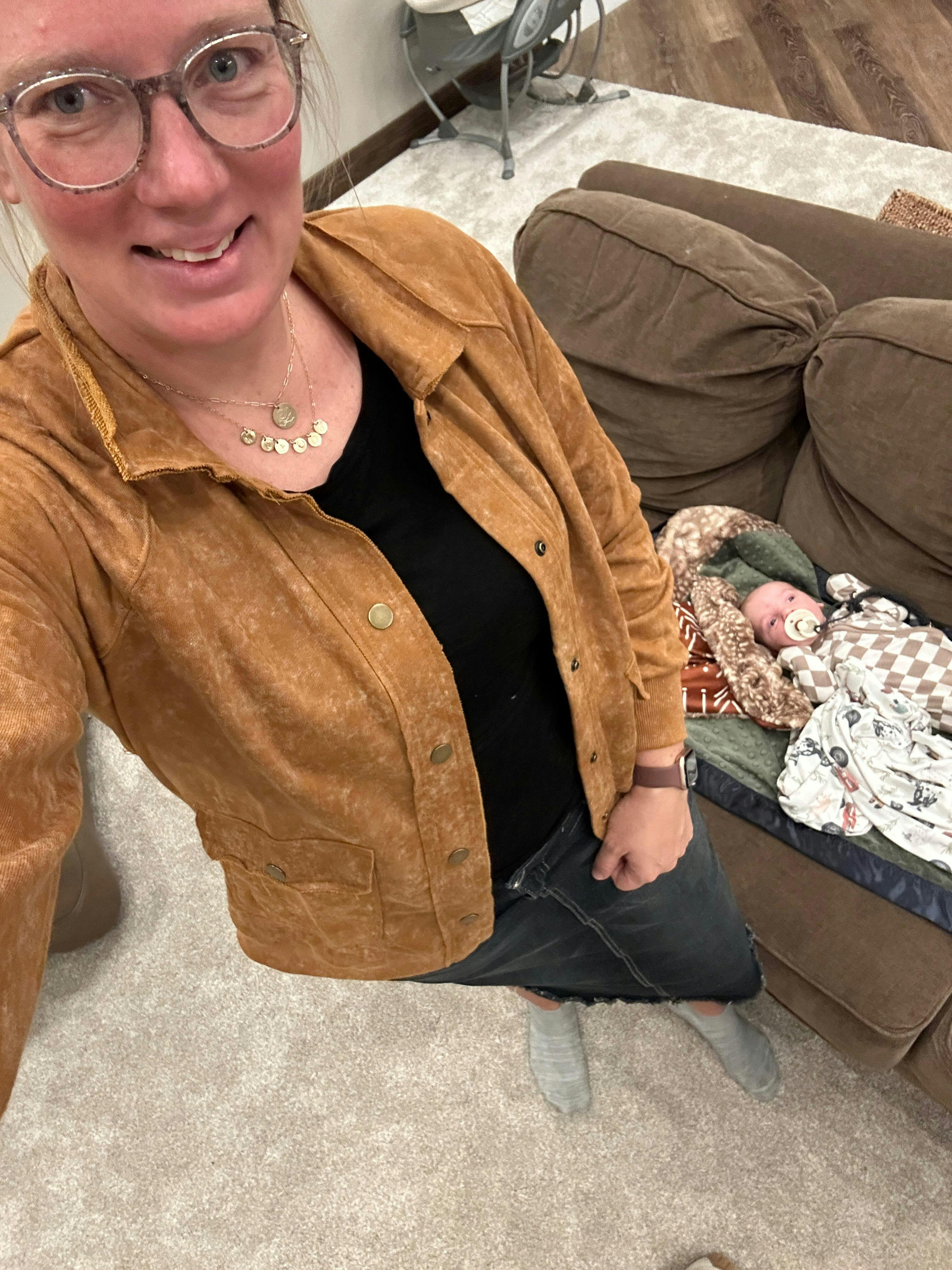 This jacket has the perfect fall vibes and fit me as a true medium perfectly!! Even works great for a pregnant belly!!😅😉 jackets and layers are my go too when pregnant !