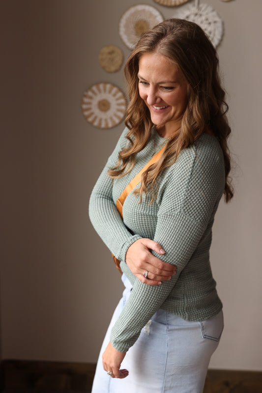 Experience comfort and style with the Lagoon Blue Waffle Top, perfect for casual days and effortless layering.