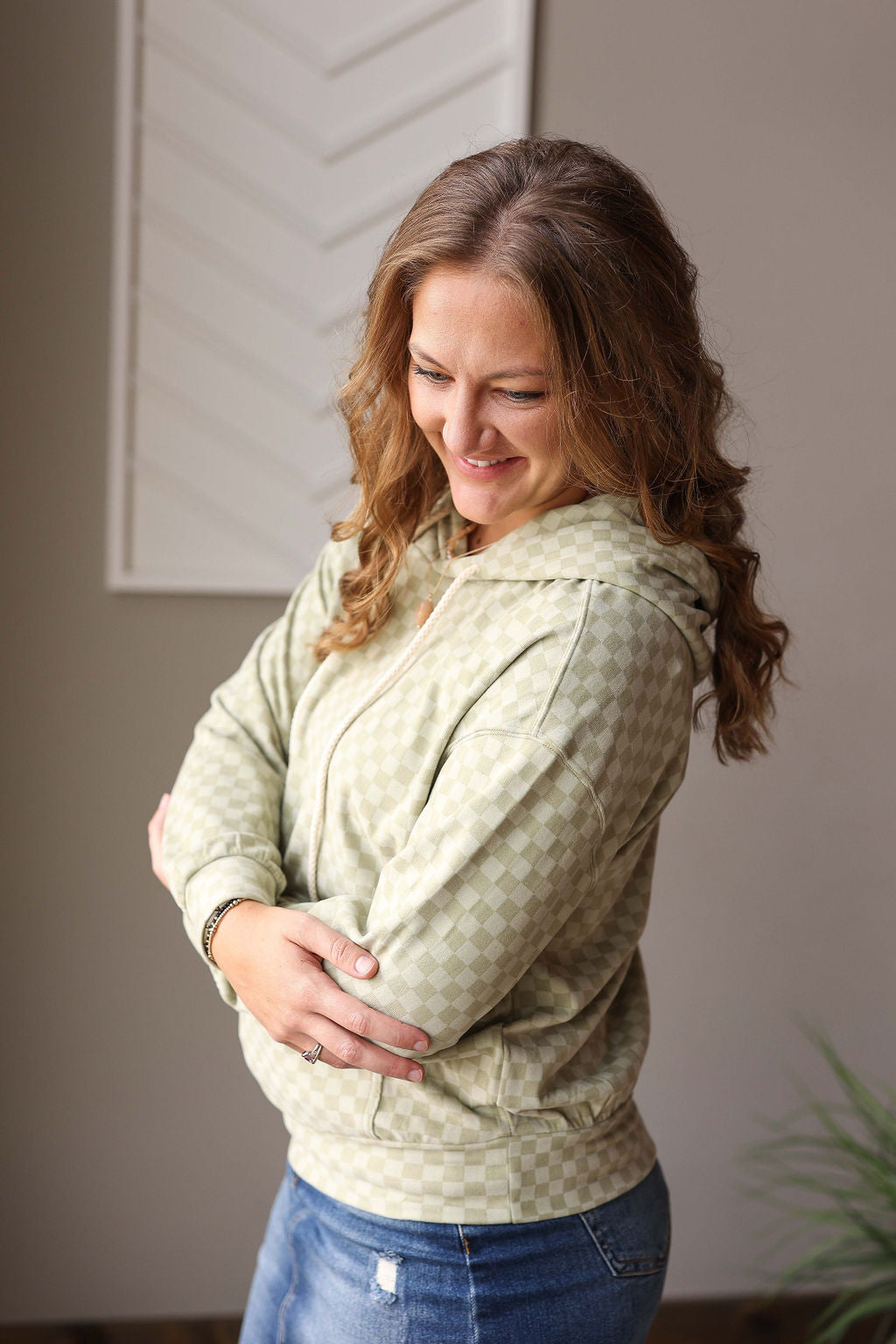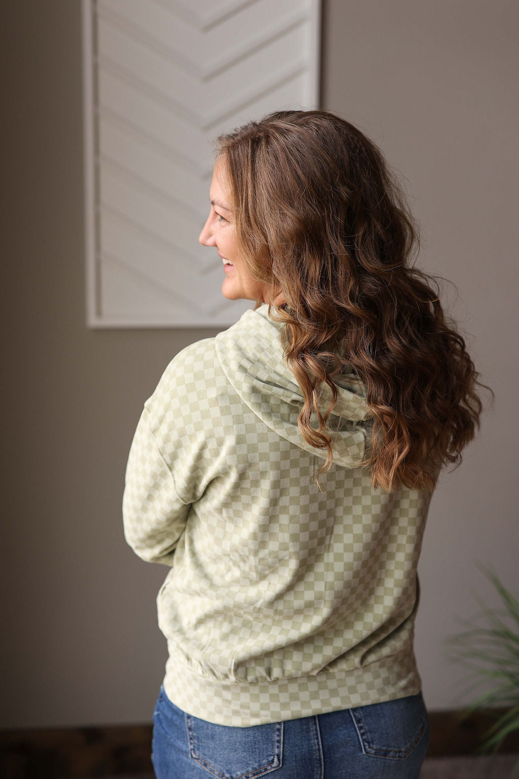 Stay stylish and comfortable with our Mint Checkered Kangaroo Pocket Hoodie! Made from a soft and light-medium weight material, this sweatshirt is perfect for any season. The subtle checkered design adds a touch of charm, making you feel cozy and chic at the same time. Get ready to be obsessed with this must-have piece!