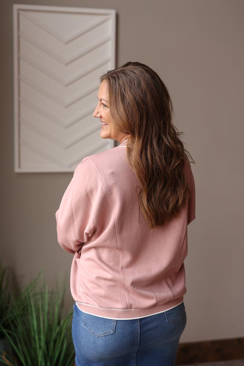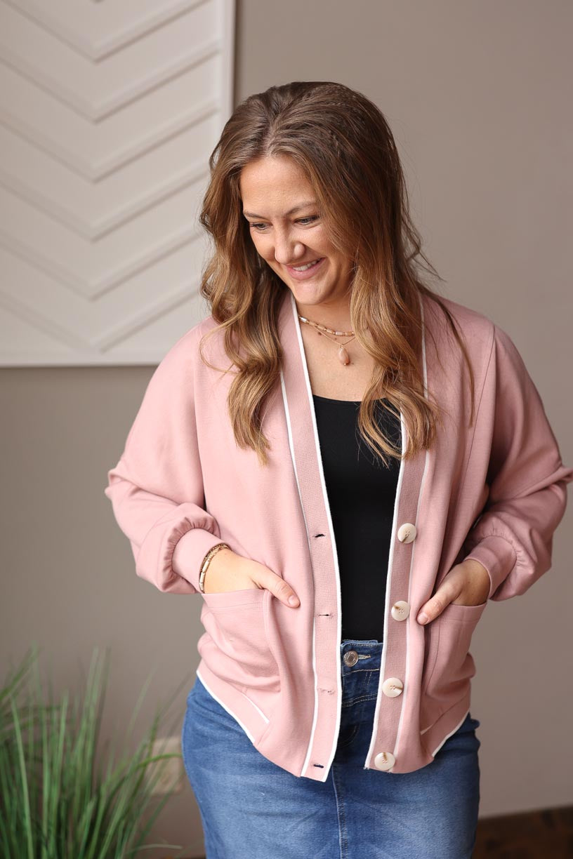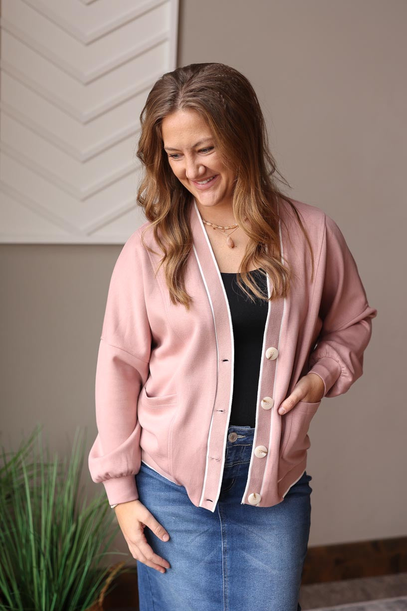 Stay stylish and cozy with our Pink V-Neck Button Knit Cardigan. The perfect transition piece for any season, it features a touch of varsity style. Whether you're heading to work or keeping it casual, pair it with a graphic tee and sneakers for an effortless and trendy look.