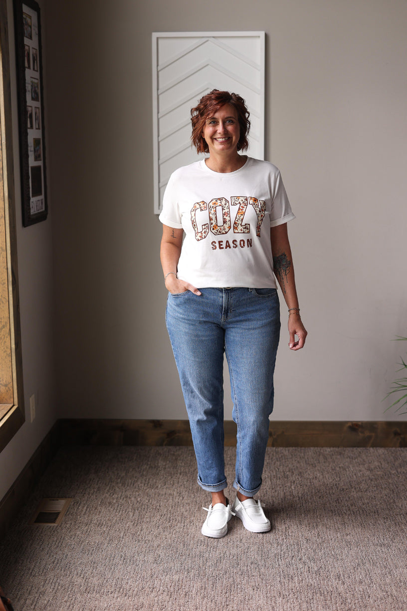 Get ready for the cozy season with our White "COZY SEASON" Floral Letter Tee, the perfect cute staple layering piece available in sizes S to 3XL PLUS!